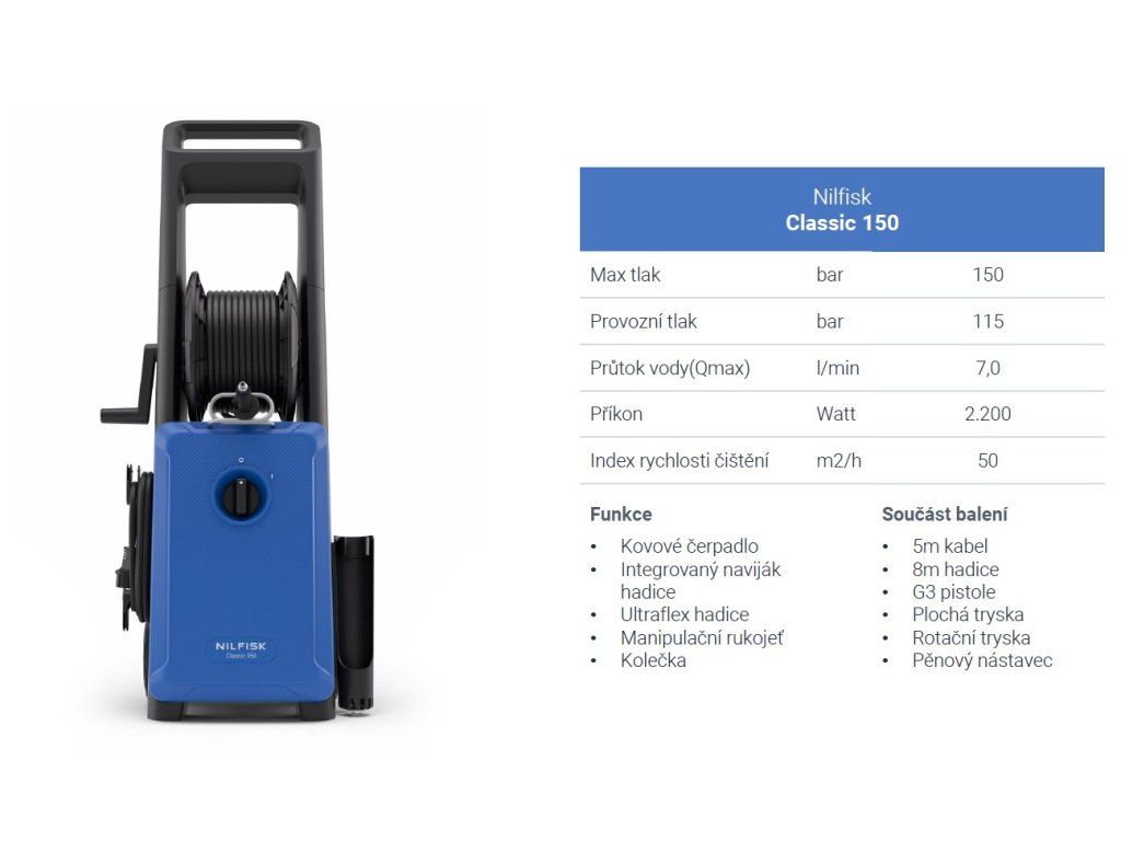Nilfisk Classic 150 představuje nejvýkonnější model z řady Classic, navržený pro pravidelné a náročnější venkovní čištění. Nabízí vysoký tlak, robustní konstrukci a praktické funkce, které usnadňují práci kolem domu i zahrady.
