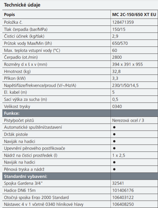 • Prodloužená 15metrová ocelová vyztužená vysokotlaká hadice DN6 (u modelu XT) pro větší dosah